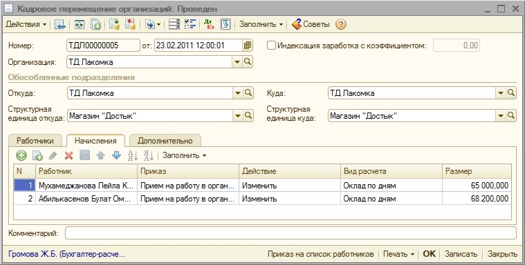 Документ «Кадровое перемещение» служит для отражения повышения тарифных ставок работников, перемещения между подразделениями и смены должности.