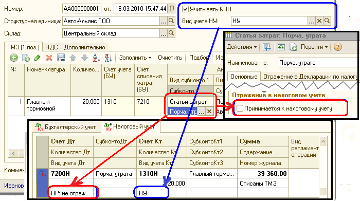 На практике может возникнуть необходимость отразить одним документом несколько корреспонденций как с видом «НУ», так и с видом «ПР». Также возможна ситуация, когда актив приобретался с видом «НУ», а списать его нужно на затраты, не относящиеся к предпринимательской деятельности — «ПР». В таких случаях, отнесение на вычеты в налоговом учете можно отрегулировать непосредственно признаком статьи затрат. Вид учета строки затрат имеет более высокий приоритет, нежели вид учета самого документа. Так, если в документе вид налогового учета установлен «НУ», а у статьи затрат отсутствует признак «Принимается к налоговому учету» (статья классифицируется как «ПР»), то операция отразится в налоговом учете по данной статье как постоянная разница.