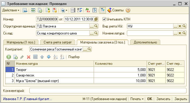 Материалы, принятые в переработку и использованные при выпуске продукции, указываются на закладке «Материалы заказчика».