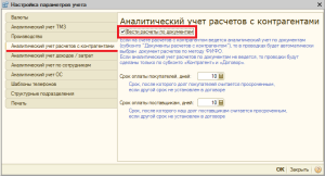 Если на предприятии существует необходимость ведения аналитического учета взаиморасчетов с контрагентами по документам, тогда при первоначальной настройке программы в «Настройках параметров учета» (меню «Предприятие» — «Настройка параметров учета») требуется установить признак «Вести расчеты по документам» на закладке «Аналитический учет расчетов с контрагентами».