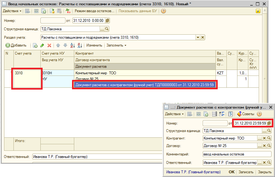 Ввод начальных остатков по взаиморасчетам с контрагентами