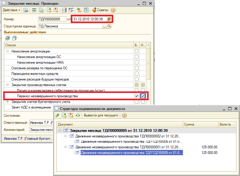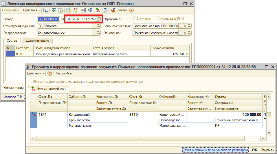 Второй документ на начало следующего месяца выполнит возврат сумм НЗП со счетов учета незавершенного производства на счета производственного учета.