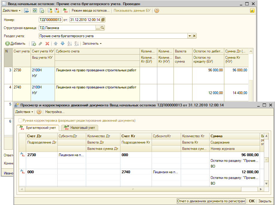 Ввод начальных остатков по НМА