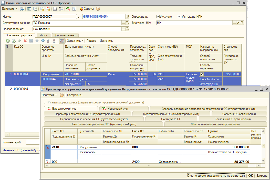 При проведении документа «Ввод начальных остатков по ОС» следует контролировать время документа, время не должно быть равно 00.00.00.