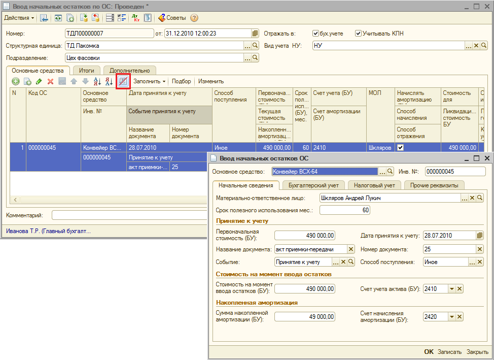 Ввод начальных остатков по основным средствам