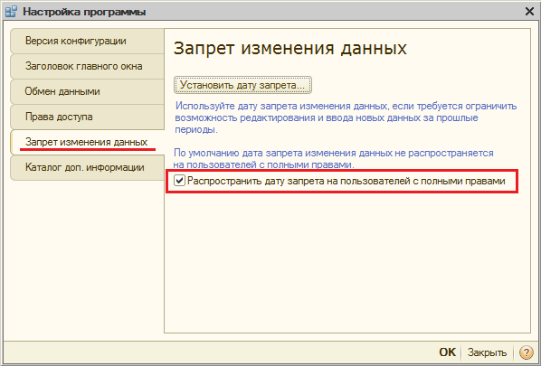 При установке даты запрета следует учитывать, что под действие данного ограничения попадают данные, период действия которых ограничен концом предыдущего дате запрета дня. То есть, например, при установке значения 01.01.2012, изменение данных будет возможно только, начиная с 01.01.2012 00:00:00 включительно.