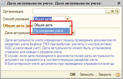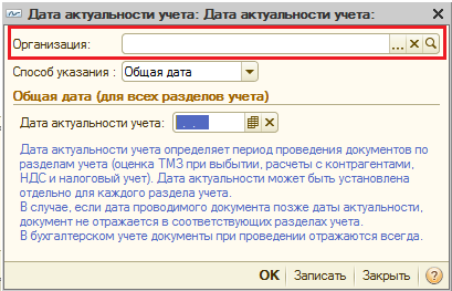 Дату актуальности учета возможно устанавливать отдельно для каждой организации одной информационной базы. Если поле «Организация» не заполнено в форме установки «Даты актуальности учета», тогда эта настройка будет распространяться на все организации информационной базы.