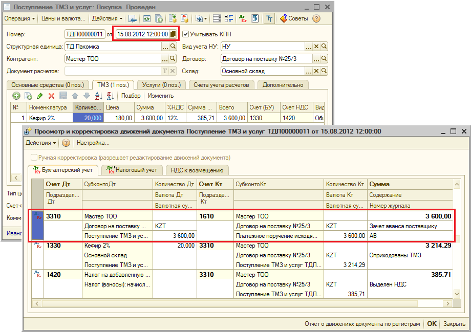 Затем, от 15.08.2012 года оформляется документ «Поступления ТМЗ и услуг» от контрагента ТОО Мастер. В том случае, если дата актуальности учета не установлена, тогда при проведении документа поступления будут сформированы проводки по зачету аванса.
