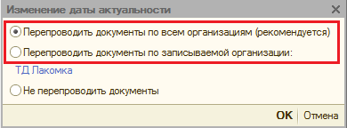 Если дата актуальности учета устанавливается впервые, то перепроведение документов не требуется. При смене даты актуальности учета на более позднюю, программой будет предложено выполнить перепроведение документов, при этом откроется окно обработки «Изменение даты актуальности учета», в котором предлагается несколько режимов перепроведения документов: перепроводить документы по всем организациям, перероводить документы по записываемой организации и не перепроводить документы.