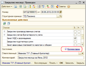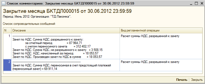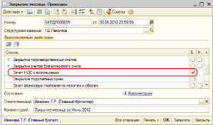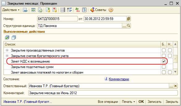 Для проведения операции зачета НДС предназначена регламентная операция «Зачет НДС к возмещению» в документе «Закрытие месяца» (меню Операции — Регламентные операции — Закрытие месяца).