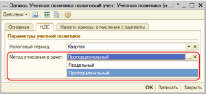 Расчет суммы НДС, относимого в зачет, зависит от метода отнесения НДС в зачет, который устанавливается в настройках учетной политики по налоговому учету (меню Предприятие — Учетная политика — Учетная политика (налоговый учет)) на закладке «НДС».