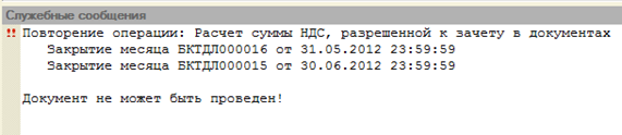 Регламентная операция «Зачет НДС к возмещению» проводится один раз в отчетном квартале, как правило, последним днем месяца отчетного квартала. В случае если в отчетном квартале уже была проведена данная операция, то программа выдаст сообщение: