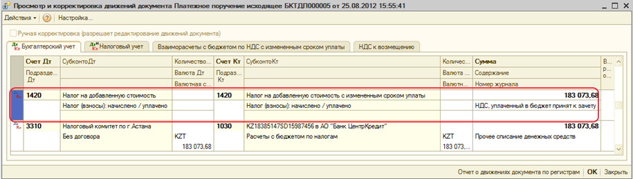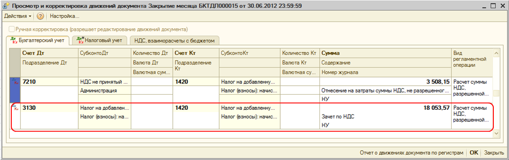 В результате проведения документа будет сформирована проводка по выделению НДС с измененным сроком уплаты на счет 1420. Поскольку данный вид НДС принимается к зачету только в момент оплаты, документом будет сформирована проводка в дебет счета 1420 по виду налога «НДС с измененным сроком уплаты», т. к. при выполнении регламентной операции «Зачет НДС к возмещению» документа «Закрытие месяца» данный вид налога не участвует в расчете НДС к возмещению.