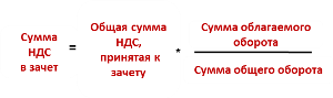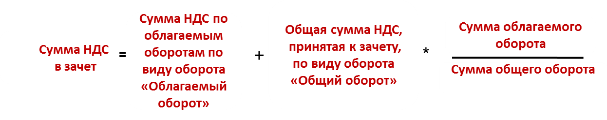 Сумма НДС по регистрам накопления «НДС к возмещению» и «Корректировка НДС к возмещению» с учетом доли облагаемого оборота в общем обороте Сумма НДС по регистрам накопления «НДС к возмещению» и «Корректировка НДС к возмещению» по виду оборота «Облагаемый оборот» плюс сумма НДС по виду оборота «Общий оборот» с учетом доли облагаемого оборота в общем обороте