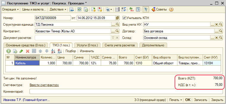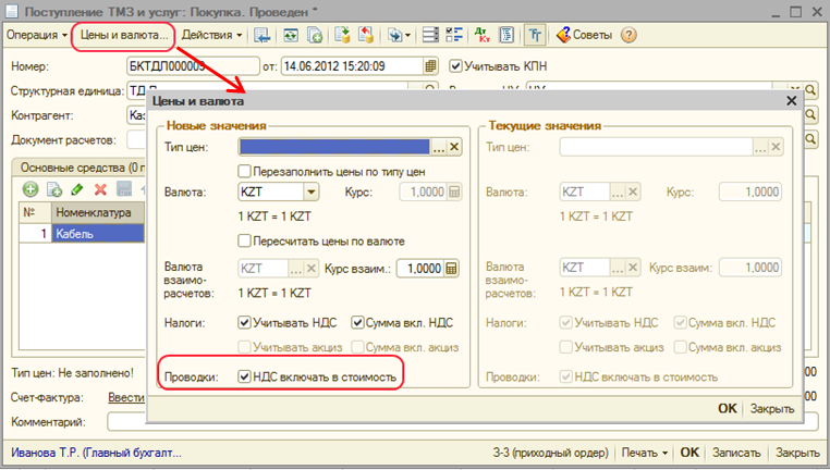 Оформление операций по приобретению товаров (работ, услуг), по которым налог на добавленную стоимость не подлежит отнесению в зачет в соответствии со статьей 257 Налогового Кодекса РК, производится в конфигурации путем установки признака «НДС включать в стоимость» (кнопка «Цены и валюты»).