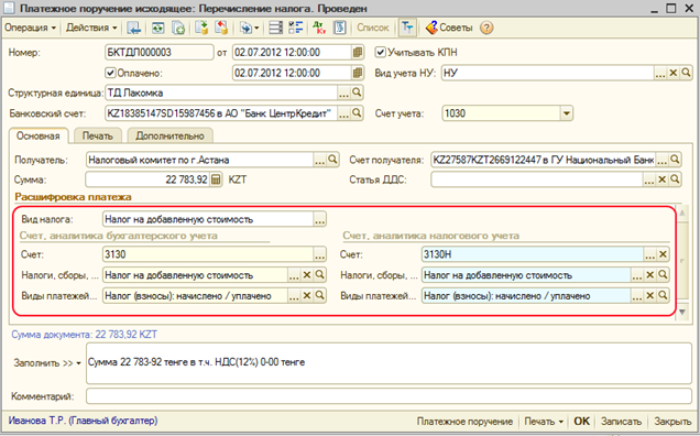 то при выборе в документе вида налога в разделе «Расшифровка платежа» будет произведено автоматическое заполнение счетов и аналитики бухгалтерского и налогового учета.