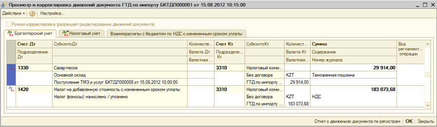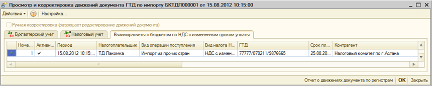 Также при проведении документа формируется запись в регистр накопления «Взаиморасчеты с бюджетом по НДС с измененным сроком уплаты».