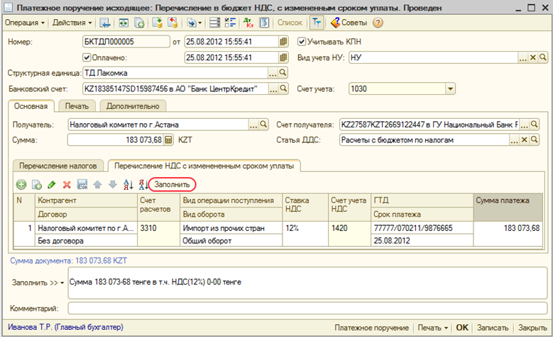 В случае если производится перечисление в бюджет суммы НДС с измененным сроком уплаты, то формируется документ «Платежное поручение исходящее» с видом операции «Перечисление в бюджет НДС, с измененным сроком уплаты».