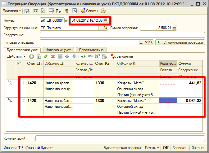 Для ввода остатков по товарам необходимо «вручную» рассчитать суммы НДС, относимого в зачет по каждому виду товара и оформить документ «Операция бухгалтерский (налоговый) учет» (меню «Операции») на дату постановки на учет по НДС по счету 1420 в корреспонденции со счетом учета ТМЗ.