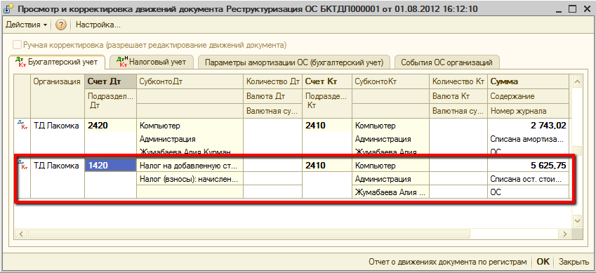 При проведении документа сформируются проводки по списанию суммы НДС с основного средства на счет учета НДС к возмещению.