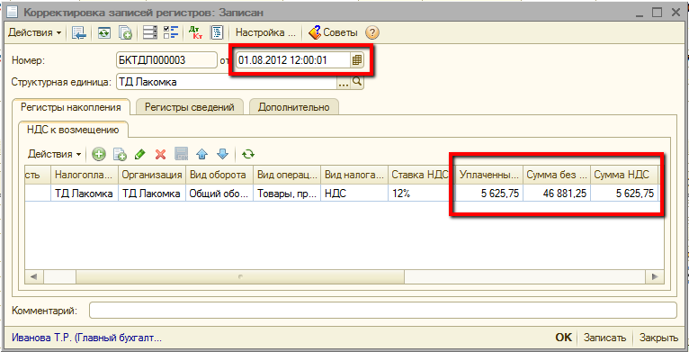 Для формирования записей в регистре «НДС к возмещению» необходимо оформить документ «Корректировка записей регистров» и выполнить корректировку регистра накопления «НДС к возмещению» датой постановки на учет по НДС.