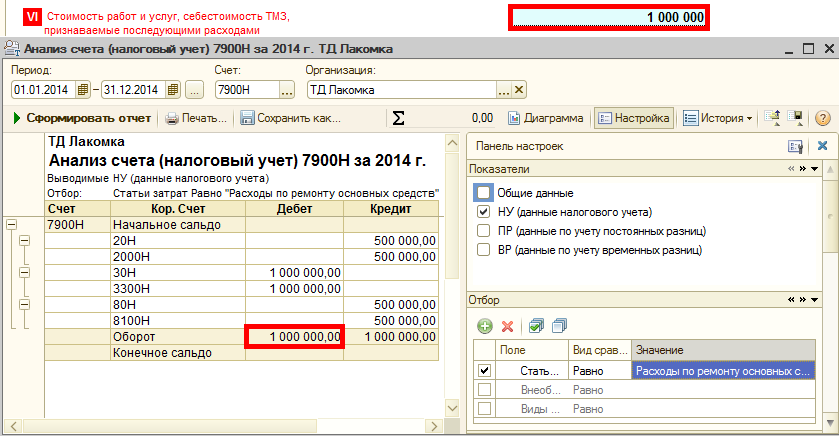 Проверить корректность формирования строки 100.00.009.VI можно при помощи отчета Анализ счета (налоговый учет), сформированного по счету 7900Н с отбором по статьям затрат, которые удовлетворяют условия формирования данной подстроки. Проверить какие статьи затрат ссылаются на подстроку 100.00.009.VI можно через регистр сведений Коды строк Декларации по налогу на прибыль.