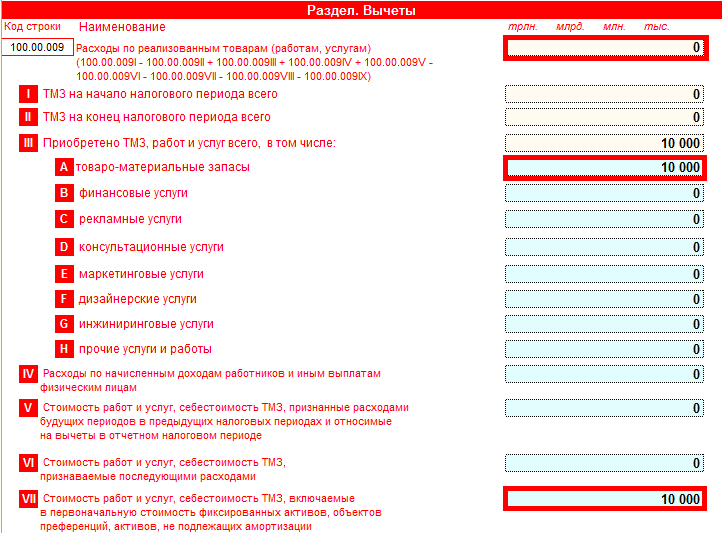 Пример: в отчетном периоде организацией приобретены ТМЗ на сумму 10 000 тг. Данные ТМЗ использованы в строительстве собственного здания. Стоимость приобретенных ТМЗ отразится по строке 100.00.009IIIA, отнесение стоимости ТМЗ на строительство отразится по строке 100.00.009VII. Таким образом, в строке 100.00.009 вычет по ТМЗ, использованным в строительстве не образуется.
