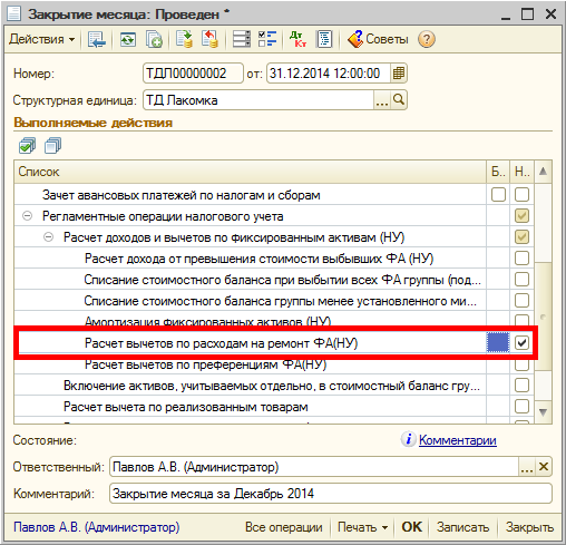 Для того чтобы стоимость ремонта отразилась в приложении 100.02, необходимо выполнить регламентную операцию «Расчет вычетов по расходам на ремонт ФА (НУ)» в документе Закрытие месяца.