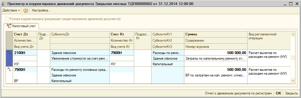 Пример отражения расходов по капитальному ремонту: организацией произведен капитальный ремонт Здания офисного на сумму 500 000 тг. приобретение услуг по ремонту оформлено документом Поступление ТМЗ и услуг. Затраты на ремонт в бухгалтерском учете отражаются по счету 2933, в налоговом учете указывается счет — 7900Н, вид ремонта — «капитальный». Статья затрат, указанная в документе, ссылается на код строки 100.00.009 IIIH.