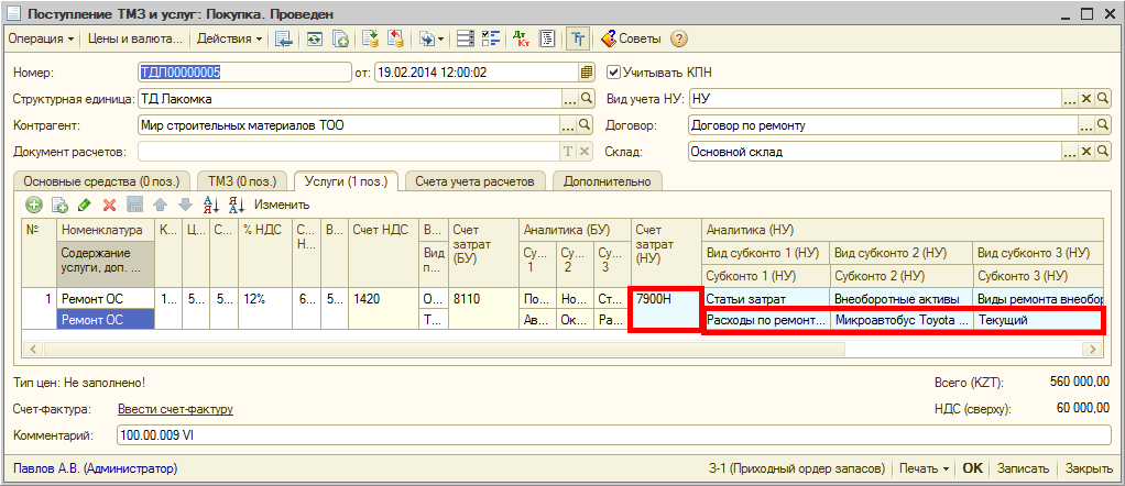 Пример отражения расходов по текущему ремонту: организацией произведен текущий ремонт Здания офисного на сумму 500 000 тг. Приобретение услуг по ремонту оформлено документом Поступление ТМЗ и услуг. Затраты на ремонт в бухгалтерском учете отражаются по счету 8110, в налоговом учете указывается счет — 7900Н, вид ремонта — «текущий». Статья затрат, указанная в документе, ссылается на код строки 100.00.009.IIIH.