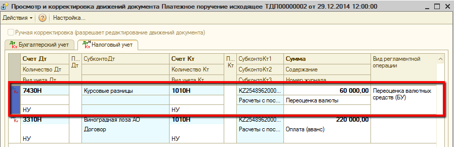 В момент оплаты курс валюты оказался ниже курса последней переоценки. Поэтому остаток валютных средств был переоценен документом по новому курсу, что привело к образованию отрицательной курсовой разницы в размере 60 000 тг.