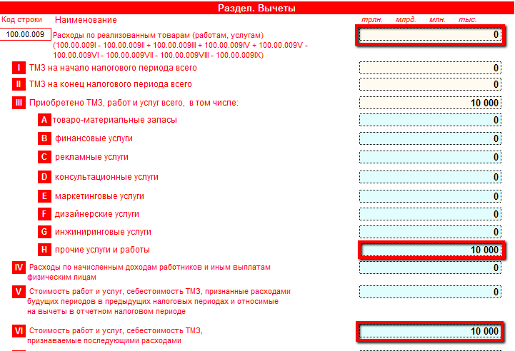 Пример: У организации на начало налогового периода имеются ТМЗ на сумму 10 000 тг. В отчетном периоде ТМЗ были реализованы. Таким образом, в Декларации за период отразятся следующие данные: строка 100.00.009I – 10 000 тг., строка 100.00.009II - 0 тг. (ТМЗ реализованы). У организации образуется вычет в размере 10 000 тг. по строке 100.00.009.