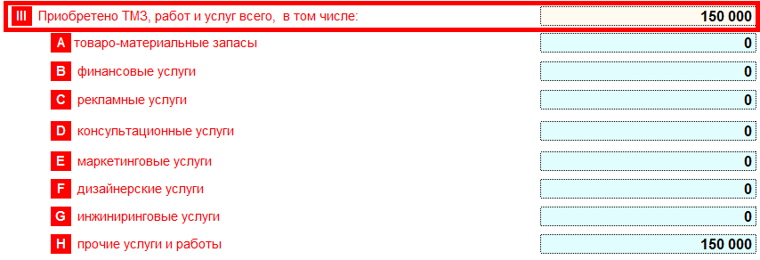 В строке 100.00.009V Стоимость работ, услуг, себестоимость ТМЗ, признанные расходами будущих периодов в предыдущих налоговых периодах и относимые на вычеты в отчетном налоговом периоде отражаются только РБП, приобретенные в прошлых периодах и относимые на вычеты в текущем.