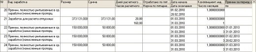В каждом из вышеперечисленных документов на закладке «Расчет среднего заработка» расположена табличная часть с результатами расчета по каждому месяцу расчетного периода. При этом для премий, начисленных более чем за один месяц, выводится доля премии, приходящаяся на каждый месяц расчетного периода среднего заработка, совпадающий с периодом, за который была начислена премия. Например, если была начислена премия в марте 2010 года сотруднику Другову С.В. за первый квартал 2010 года в размере 150 тыс. тг. При расчете среднего заработка мы увидим, что в табличной части будет в данном случае присутствовать 3 строки с начислением «Премии, полностью учитываемые в ср. заработке (начисленные пропорционально отработанному времени)» с суммой 50 тыс. тг., приходящейся на каждый месяц периода действия премии.