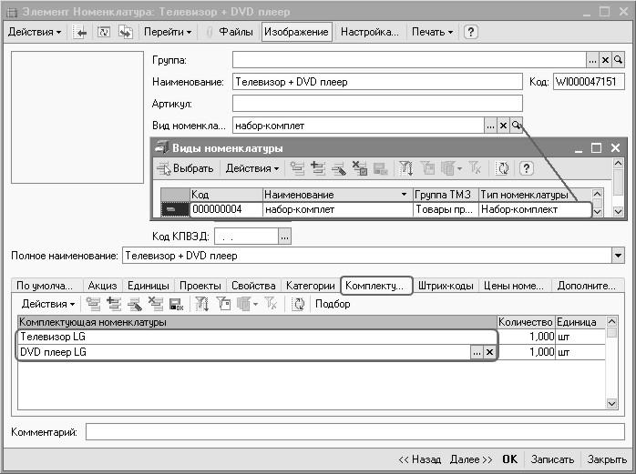 Таким образом, бонусным комплектом является – новая позиция в справочнике «Номенклатура» - «Телевизор + DVD плеер».
