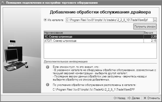 Автоматически в список доступных к добавлению обработок загрузятся обработки обслуживания, которые соответствуют текущей версии механизма торгового оборудования и не были загружены ранее.