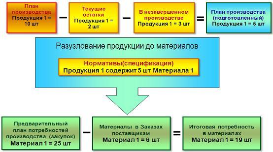 На основании спланированных объемов производства можно получить потребность в материалах. Для этого используется разузлование продукции/услуг по спецификациям до материальных составляющих.