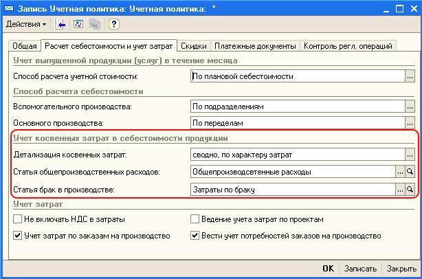 Особой частью расходов, требующей к себе внимательного отношения, являются общепроизводственные накладные расходы. Общепроизводственные накладные расходы – это производственные затраты, которые нельзя сопоставить с изготовлением конкретной продукции. При включении таких расходов в себестоимость продукции есть возможность сворачивать их в одну статью или же учитывать детально по каждой статье. Правило настраивается в учетных политиках управленческого и регламентированного учета. Если выбирается метод учета косвенных затрат в себестоимости продукции «сводно, по характеру затрат», то необходимо указывать статьи, в которые будут сворачиваться общепроизводственные расходы и затраты по браку.