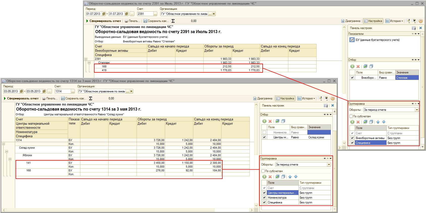 Получить данные по 168 специфике можно при помощи стандартной бухгалтерской отчетности. Для этого в настройках отчета необходимо установить группировку по специфике как показано на рисунке.