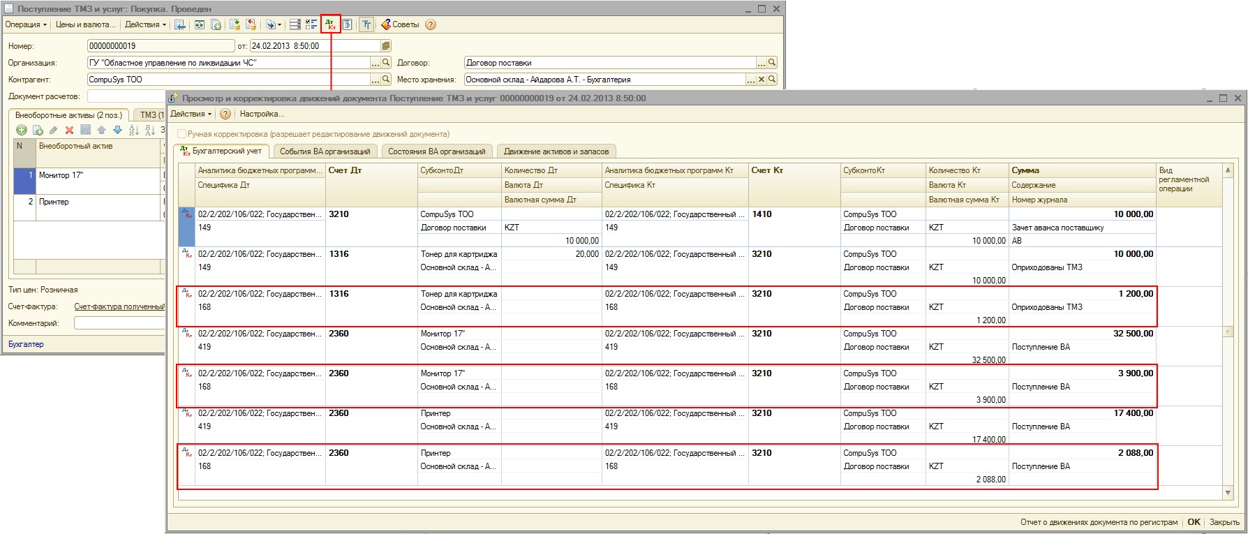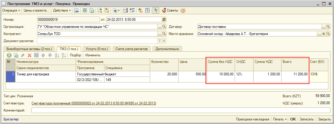 Таким образом, начиная с 1 января 2013 года, учет активов и услуг ведется по основным спецификам, по которым приобретаются активы или товары (сумма без НДС) и по специфике 168 (сумма НДС).