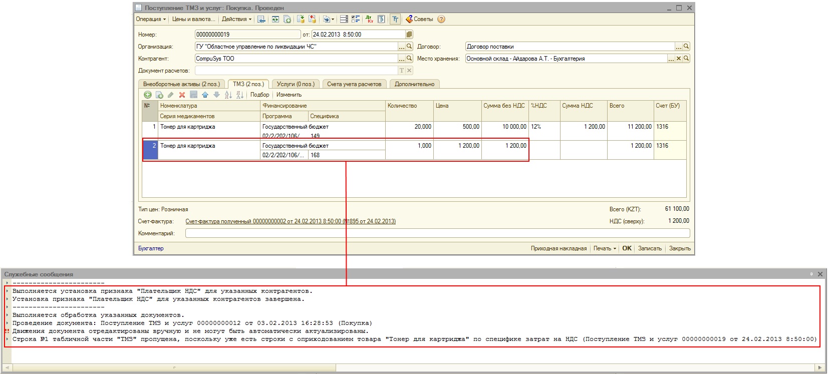 Если установлен признак «Введенная сумма в документах поступления включает НДС», то колонка «Сумма НДС» в табличных частях документов будет заполняться с учетом того, что уже введенная сумма включает НДС. Например, если в табличной части «ТМЗ» документа «Поступление ТМЗ и услуг» указана сумма 10 000 тг. и значение ставки НДС выбрано 12%, то при выполнении обработки с установленным признаком «Введенная сумма в документах поступления включает НДС» значение в колонке «Сумма НДС» будет равно (10 000 тг. * 12%)/(100% + 12%) = 1 071,4 тг., при этом в колонку «Сумма без НДС» будет записано значение 10 000 – 1 071,4 = 8 928,60 тг. При этом, по основной специфике учета запаса будет сформирована проводка на сумму 8 928,60 тг., а по специфике 168 будет сформирована проводка на сумму 1 071,4 тенге. Общая сумма проводки будет равна 10 000 тг.