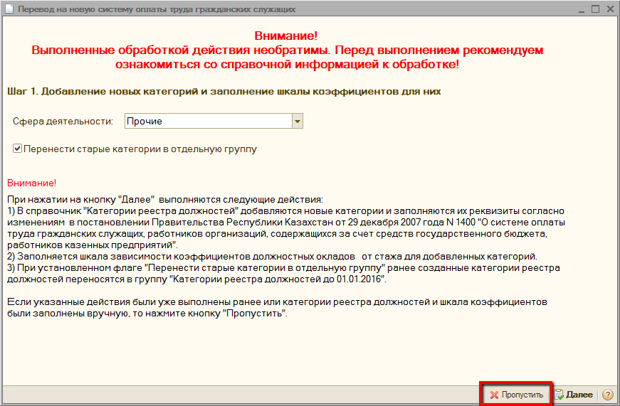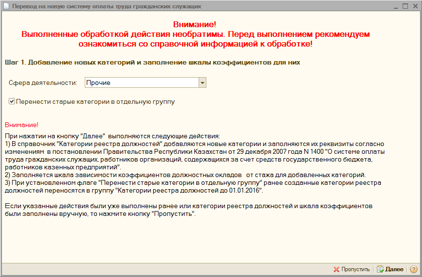 На первом шаге обработки производятся настройки для автоматического заполнения справочника «Категории реестра должностей». В реквизите «Сфера деятельности» необходимо указать сферу деятельности организации из трех вариантов: «Прочие», «Образование» или «Здравоохранение». В зависимости от сферы деятельности будут заполняться коэффициенты новой шкалы реестра должностей.