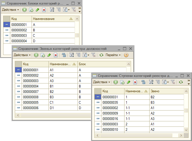 Создание элементов справочников «Блоки категорий реестра должностей», «Звенья категорий реестра должностей» и «Ступени категорий реестра должностей» в соответствии с приложением 2 к постановлению Правительства Республики Казахстан от 29 декабря 2007 года № 1400: