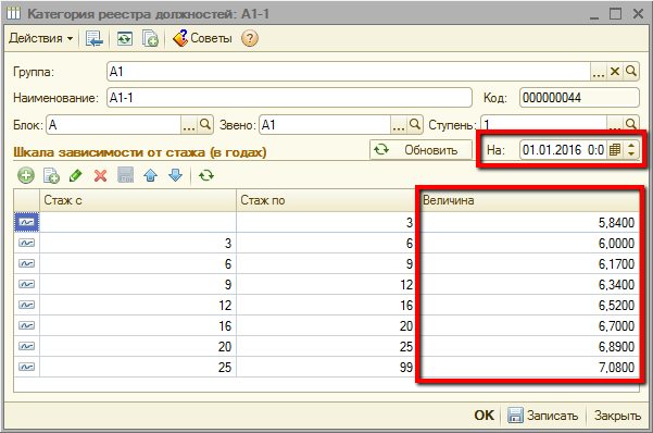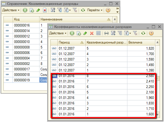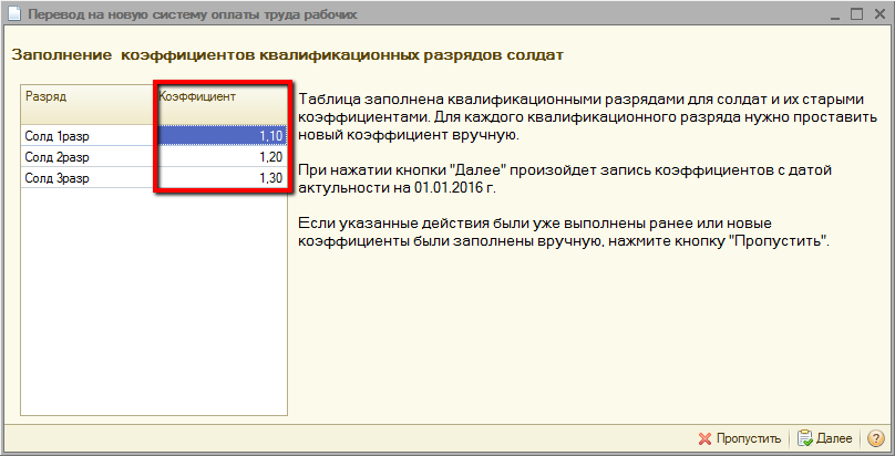 По нажатию кнопки «Далее» на 01.01.2016 будут произведены записи коэффициентов в регистр сведений «Коэффициенты квалификационных разрядов».
