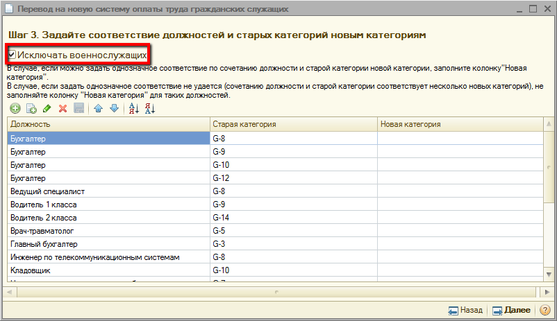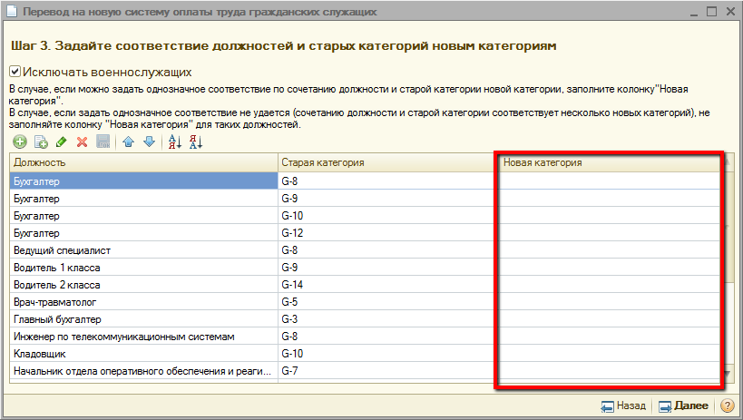 На третьем шаге необходимо заполнить соответствие должностей и старых категорий новым категориям. Для этого на форме обработки предусмотрена табличная часть, содержащая колонки «Должность», «Старая категория», «Новая категория».