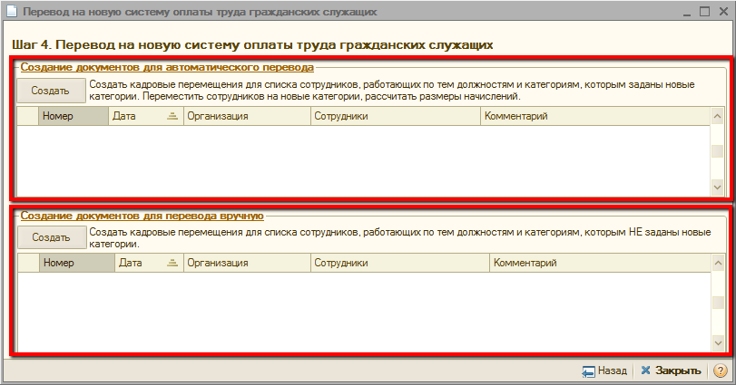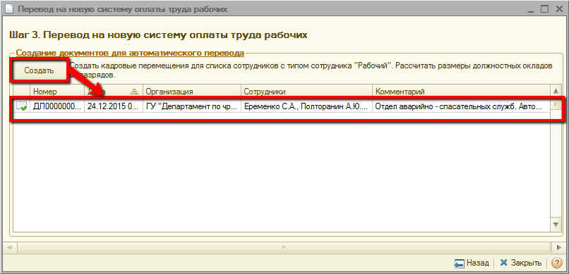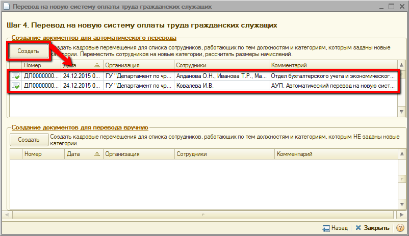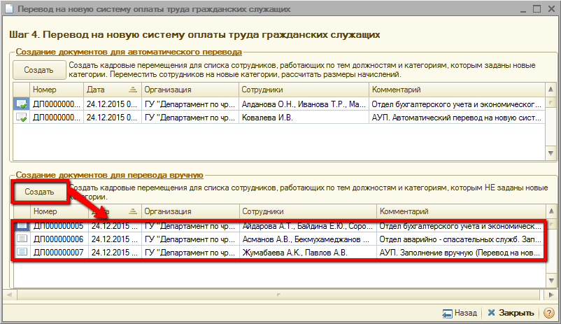 В табличной части «Создание документов для автоматического перевода» по нажатию кнопки «Создать» создаются документы кадровых перемещений организаций с комментарием «Автоматический перевод на новую систему оплаты труда гражданских служащих».
