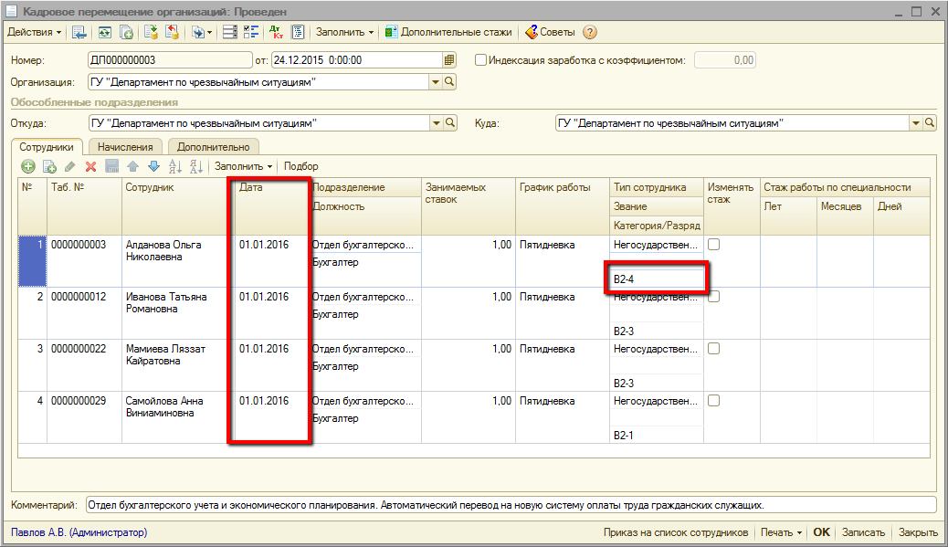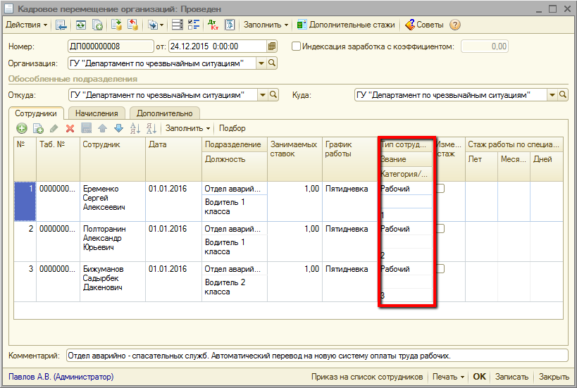 Табличные части «Сотрудники» документов «Кадровое перемещение» заполняются списками сотрудников, работающих на тех должностях и категориях, для которых на втором шаге была заполнена колонка «Новая категория». В качестве категории сотрудникам устанавливается значение колонки «Новой категории» из таблицы соответствия.