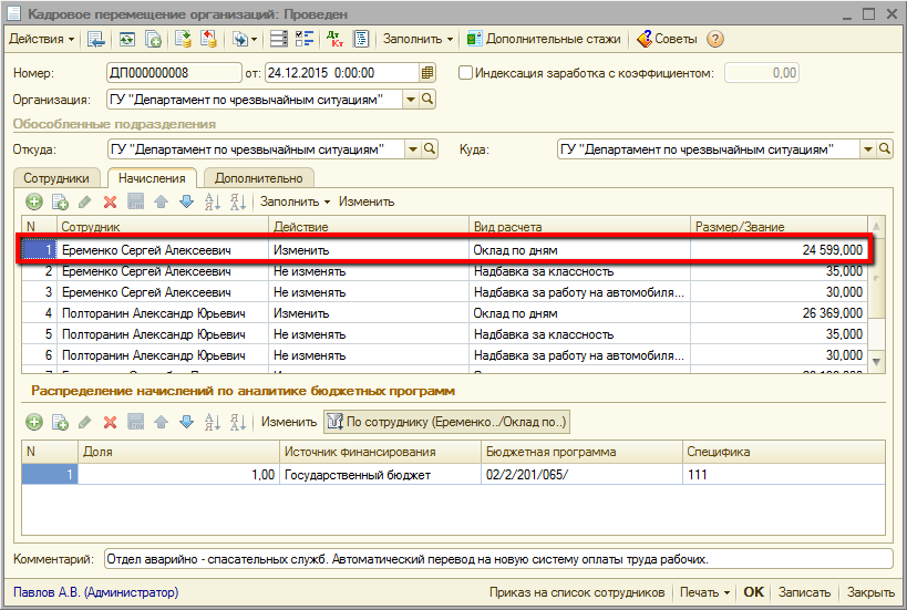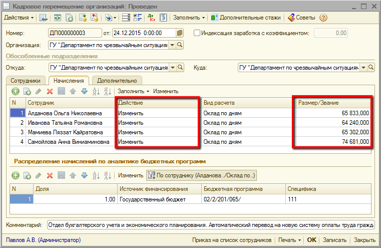 Табличные части «Начисления» заполняются всеми действующими начислениями сотрудников. Размеры видов начислений, зависящих от категории сотрудников, рассчитываются автоматически по новой шкале. Для начислений устанавливается действие «Изменить».