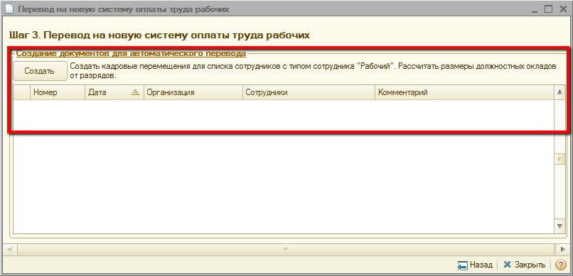 В табличной части «Создание документов для автоматического перевода» по нажатию кнопки «Создать» создаются документы кадровых перемещений организаций с комментарием «Автоматический перевод на новую систему оплаты труда рабочих».