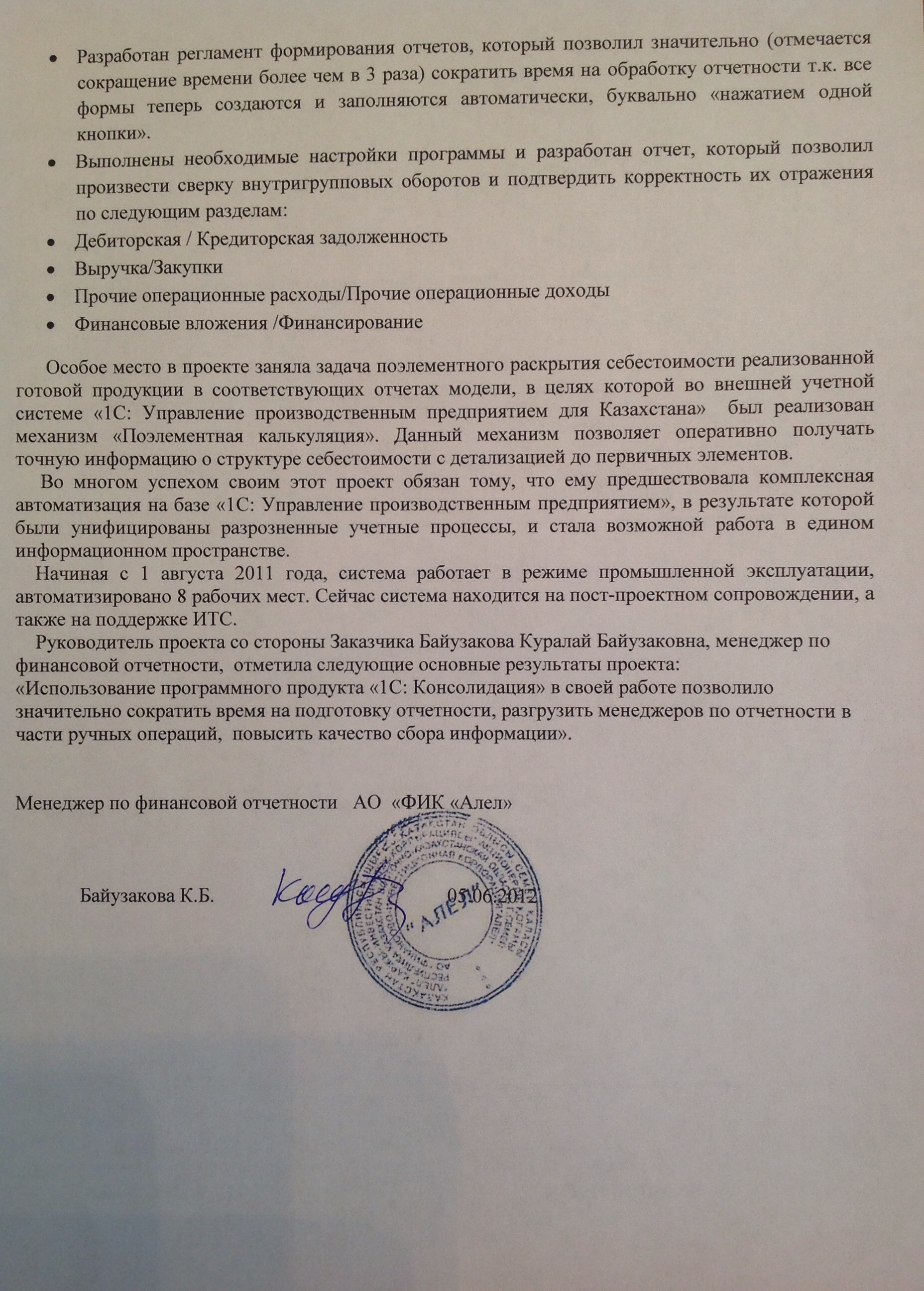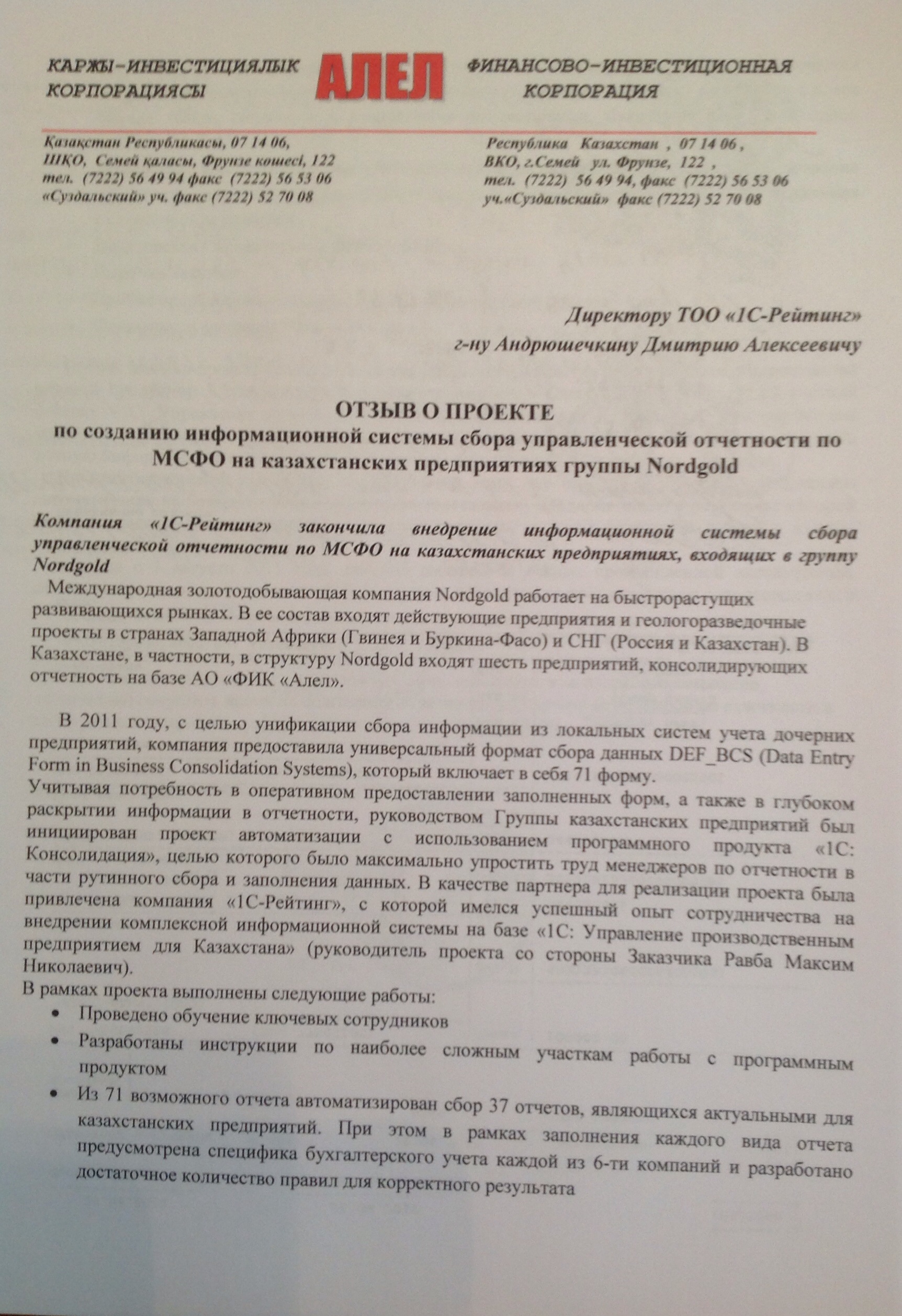 Учитывая потребность в оперативном предоставлении заполненных форм, а также в глубоком раскрытии информации в отчетности, руководством Группы казахстанских предприятий был инициирован проект автоматизации с использованием программного продукта «1С:Консолидация», целью которого было максимально упростить труд менеджеров по отчетности в части рутинного сбора и заполнения данных. В качестве партнера для реализации проекта была привлечена компания «1С-Рейтинг», с которой имелся успешный опыт сотрудничества на внедрении комплексной информационной системы на базе «1С:Управление производственным предприятием для Казахстана» (руководитель проекта со стороны Заказчика Равба Максим Николаевич).